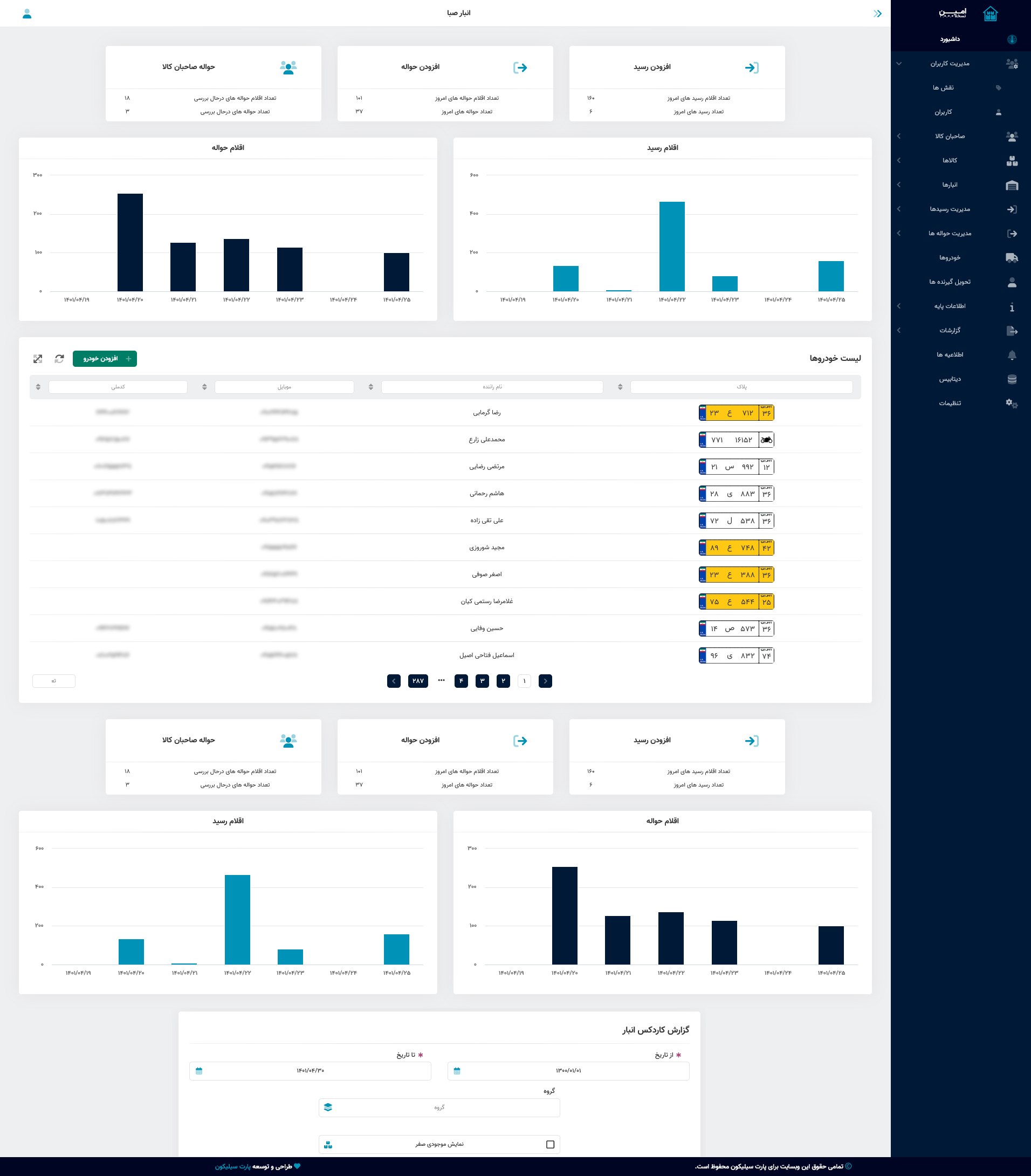یک سامانه جامع انبارداری که از ثبت تا موجودی لحظه ای کالا و لیست انبارها و صاحبان کالاها و رسید ها را می توانید با آن مدیریت کنید.